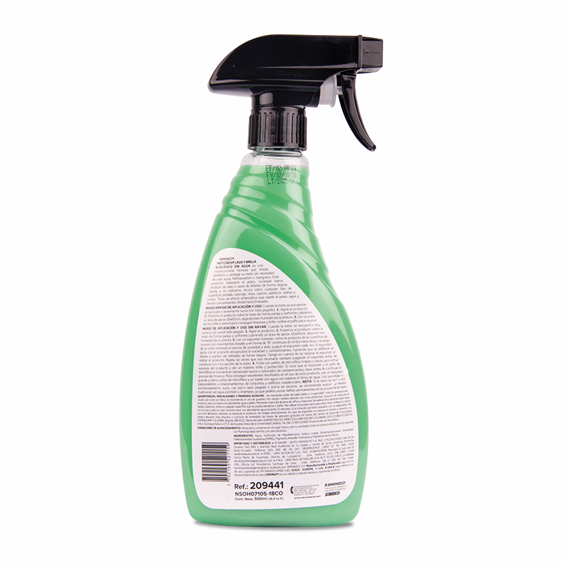 MOTO BIEN LAVA Y BRILLA ECOLÓGICO SIN AGUA es una revolucionaria fórmula que limpia, abrillanta y protege su moto sin necesidad de usar agua, hidrolavadora o manguera. Este producto removerá el polvo, suciedad ligera, residuos de aves o savia de árboles de forma segura, rápida y sin esfuerzo. Actúa sobre cualquier tipo de superficie pintada, carenaje, rines, caucho, plásticos, vidrios y cromo. Tiene un efecto antiestático que repele el polvo, agua y demás contaminantes. Rinde hasta 8 lavadas.