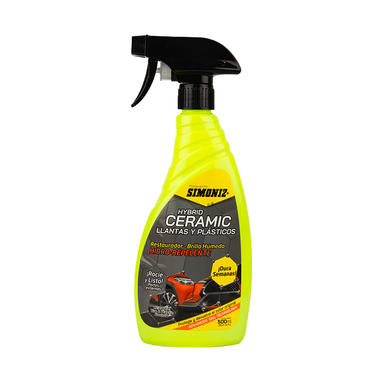 Simoniz® Hybrid ceramic llantas y plásticos, es la nueva generación de ultra protección hidro repelente que dura por semanas, manteniendo los acabados plásticos externos y llantas como nuevas. Restaura el color y lustre original. Deja una capa protectora húmeda contra los rayos UV, que previene la decoloración, resequedad y agrietamiento de llantas, bumpers, molduras, plásticos de espejos, manijas, cauchos de ventanas y en general cualquier pieza plástica natural del exterior del vehículo, creando una barrera protectora hidro-repelente que protege contra el polvo, barro y agua.