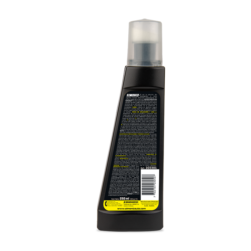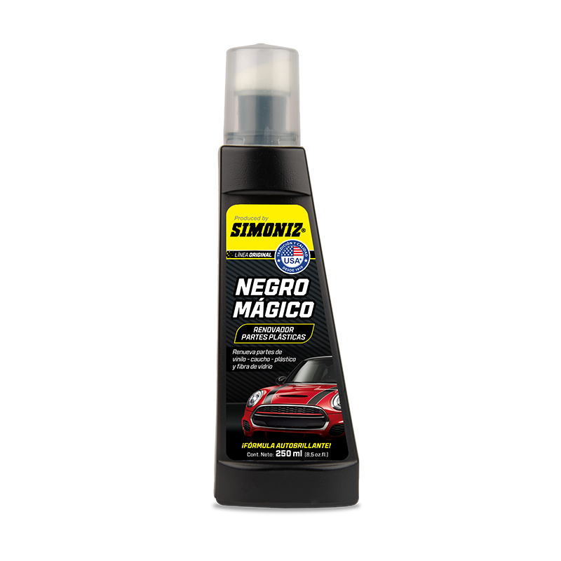 El restaurador SIMONIZ te renueva las partes negras de vinilo, caucho, plástico, paneles de puertas, techos no textiles y fibra de vidrio de su vehículo. El sol, la polución, los detergentes y otros agentes nocivos deterioran notoriamente las partes negras de su vehículo; esta fórmula es especialmente para devolver el color y brillo original a las partes negras de su vehículo; proporcionando una capa plastificante, aumentando así la protección y durabilidad.